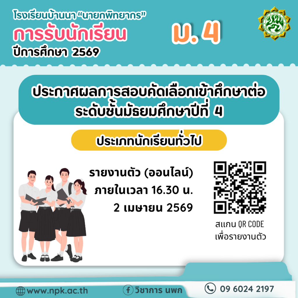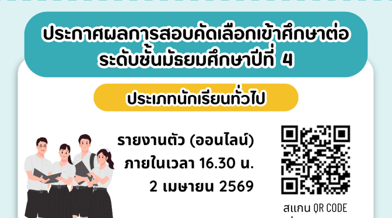 ประกาศผลสอบคัดเลือกเข้าศึกษาต่อระดับชั้นมัธยมศึกษาปีที่ 4