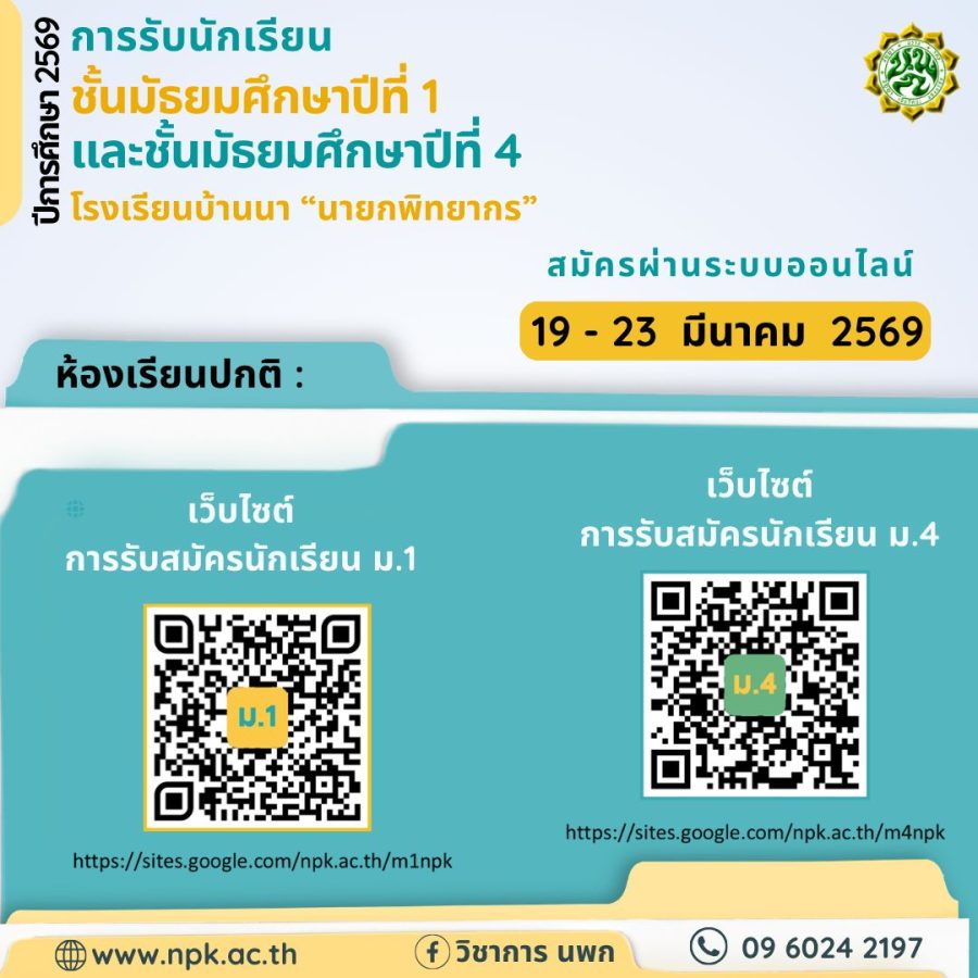 QR-Code การรับสมัครนักเรียน ม.1 และ ม.4 March 18, 2026March 19, 2026 webmaster 16 Views ลิงค์รับสมัครนักเรียน ม.1 https://shorturl.at/Z3HT5 ลิงค์รับสมัครนักเรียน ม.4 https://shorturl.at/6rB2w