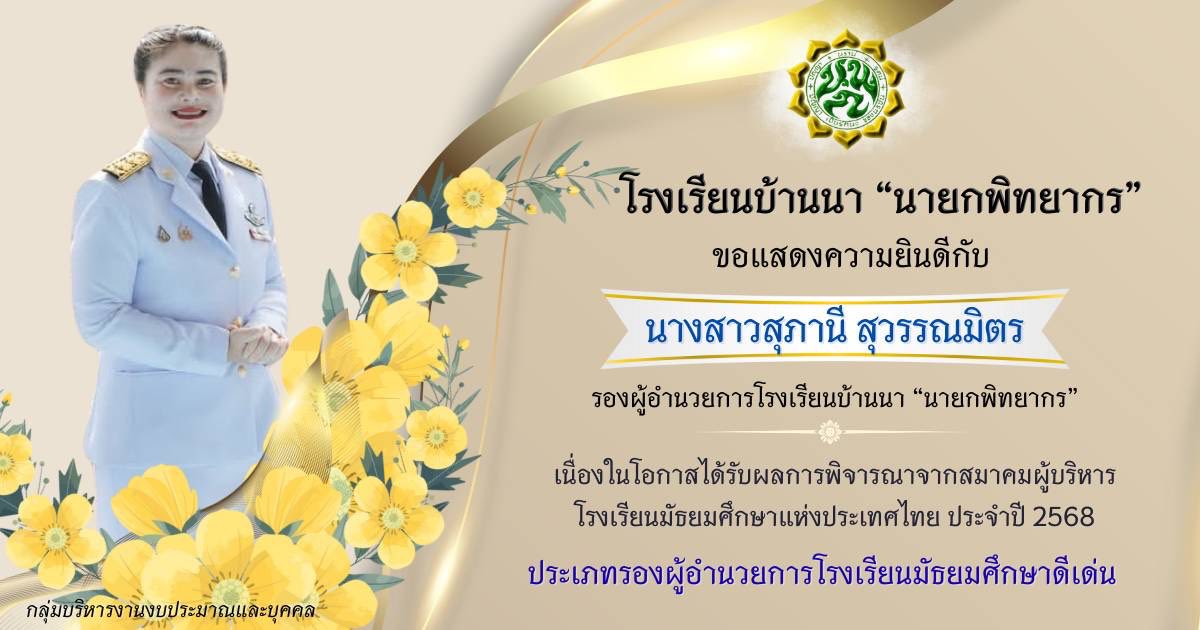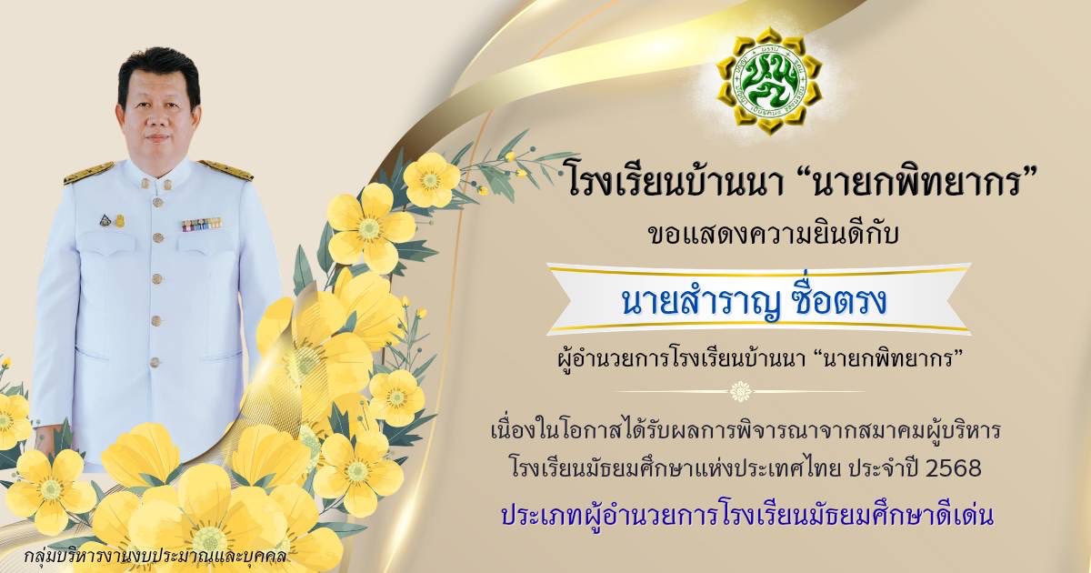 รับรางวัลผู้บริหารสถานศึกษาที่มีผลงานดีเด่นจากสมาคมผู้บริหาร โรงเรียนมัธยมศึกษาแห่ง ประเทศไทยประจำปี 2568 February 4, 2026March 27, 2026 webmaster 7 Views โรงเรียนบ้านนา “นายกพิทยากร” ขอแสดงความยินดีกับ ท่านผู้อำนวยการสำราญ ซื่อตรง และรองสุภานี สุวรรณมิตร ได้รับรางวัลเชิดชูเกียรติคุณ ผู้ที่มีคุณสมบัติปฏิบัติหน้าที่ผู้บริหารการศึกษา ผู้บริหารสถานศึกษา ที่มีผลงานดีเด่นเป็นที่ประจักษ์แก่สังคม จากสมาคมผู้บริหาร โรงเรียนมัธยมศึกษาแห่ง ประเทศไทยประจำปี 2568 โดยท่านผู้อำนวยการสำราญ ซื่อตรง รับรางวัลประเภทผู้อำนวยการโรงเรียนมัธยมศึกษาดีเด่นและ รองสุภานี สุวรรณมิตร รับรางวัลประเภทรองผู้อำนวยการโรงเรียนมัธยมศึกษาดีเด่น