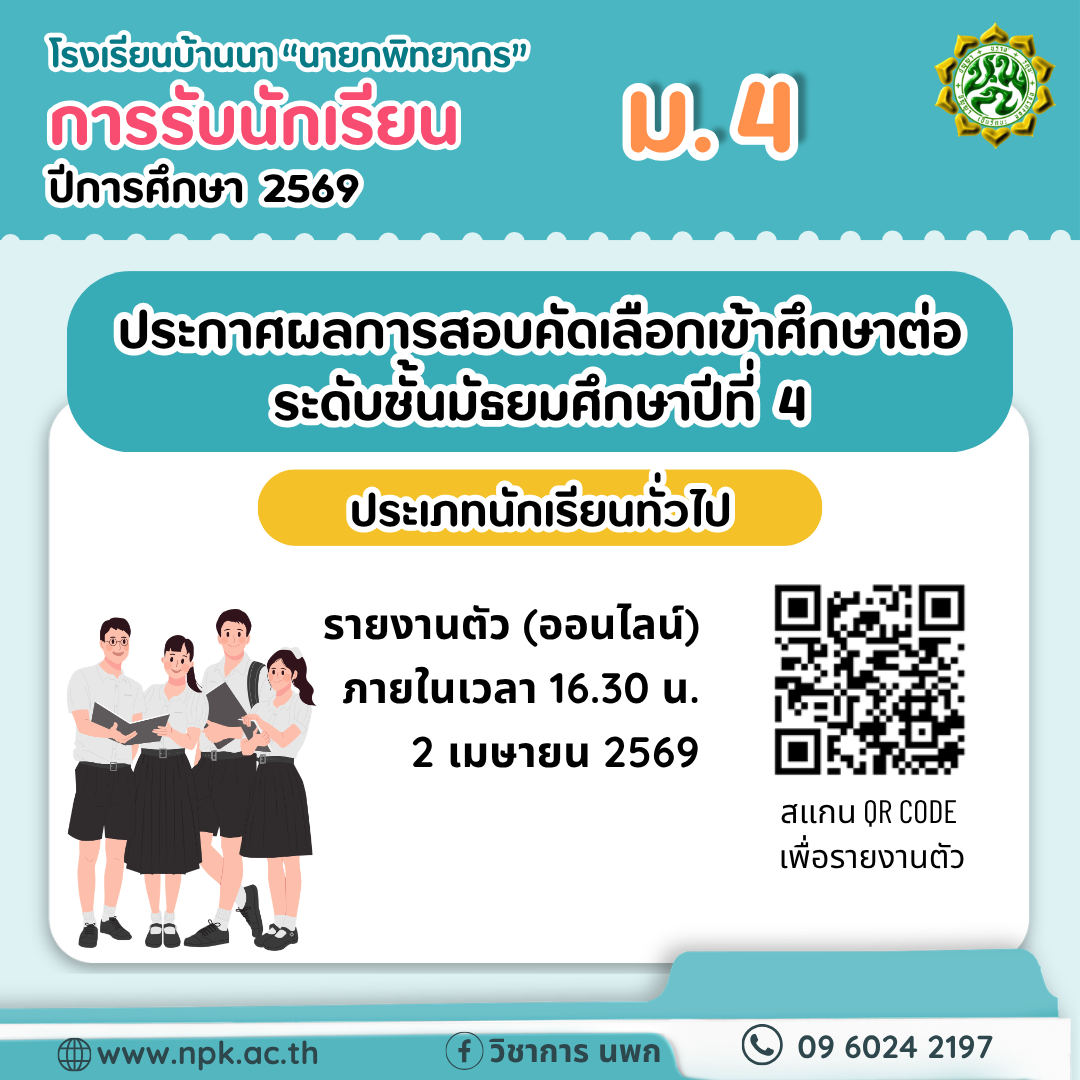 ประกาศผลสอบคัดเลือกเข้าศึกษาต่อระดับชั้นมัธยมศึกษาปีที่ 4 April 2, 2026April 1, 2026 webmaster 28 Views #ประกาศผลการสอบ คัดเลือกเข้าศึกษาต่อระดับชั้นมัธยมศึกษาปีที่ 4 ปีการศึกษา 2569 โรงเรียนบ้านนา “นายกพิทยากร” ประเภทนักเรียนทั่วไปรายชื่อผู้สอบคัดเลือกได้ (#ตัวจริง )https://drive.google.com/file/d/1dWc4iauwMhAFSfXk0HORNdn3Mpen1gpy/view?usp=drive_linkรายชื่อ #สำรองhttps://drive.google.com/file/d/1vE5Zzs909wus4tVR4PSUJoqC8Vpbuq4Z/view?usp=drive_linkลิงก์ #รายงานตัว สำหรับผู้ที่สอบคัดเลือกได้ตัวจริง และสำรองhttps://forms.gle/c4WCVeBDyYh9Brtr8รายงานตัวออนไลน์ได้ตั้งแต่ 00.01 – 16.30 น. ของวันนี้ (2 เมษายน 2569)ข้อมูลโดย…กลุ่มบริหารงานวิชาการ