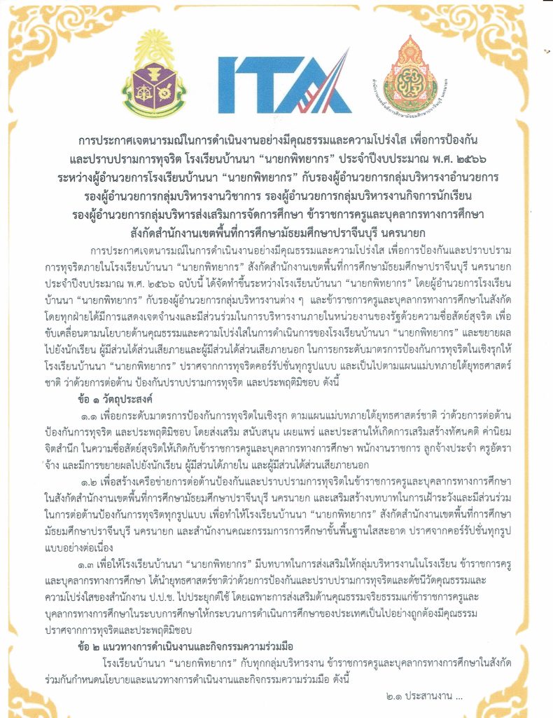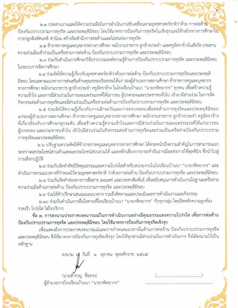 พิธีประกาศเจตนารมณ์ในการดำเนินงานอย่างมีคุณธรรมและความโปร่งใส June 9, 2023August 20, 2023 webmaster 92 Views เมื่อวันศุกร์ที่ 9 มิถุนายน พ.ศ. 2566 คณะผู้บริหารและครูโรงเรียนบ้านนา “นายกพิทยากร” ร่วมจัดกิจกรรมประกาศเจตนารมณ์ในการดำเนินงานอย่างมีคุณธรรมและความโปร่งใส เพื่อป้องกันและปราบปรามการทุจริต ประจำปีงบประมาณ 2566[ภาพโดย…ทีมงานโสตฯ]